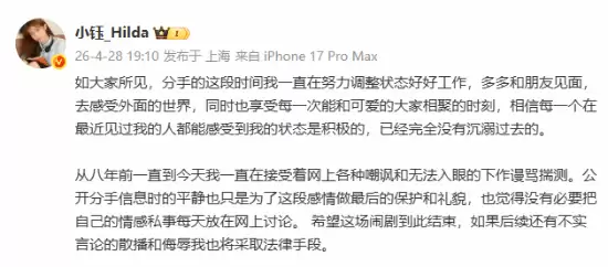 事情发展到这一步,小钰的态度也很明确了:希望这场闹剧就此画上句号。值得注意的是,她在文末也留下了清晰的底线:若后续仍有不实言论散播,或出现针对她的侮辱行为,她将不再沉默,而是会果断采取法律手段维护自身权益。这无疑是一个明确的信号。