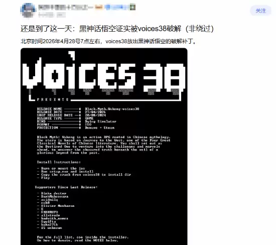 游戏圈传来一则重磅消息:根据多方网友的分享与验证,黑客组织voices38已经正式攻破了《黑神话:悟空》的Denuvo加密技术,并放出了可用的破解补丁。这意味着,这款承载了无数期待的国产3A里程碑之作,其最后的数字防护墙已被推倒。