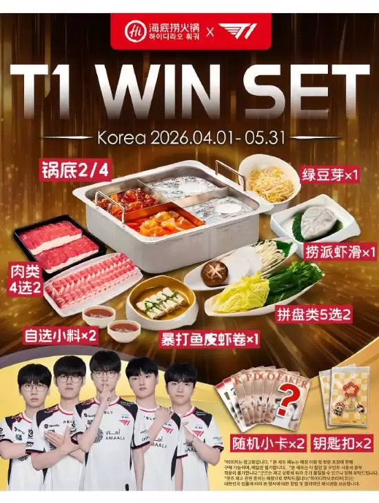 最近餐饮圈和电竞圈有个消息挺热闹:海底捞火锅和全球顶级电竞战队T1,正式官宣联名了。双方携手推出了一款限定版“T1 WIN SET”联名套餐,直接把电竞的热血激情,和火锅的沸腾美味来了个深度捆绑。这套餐自4月1日起在韩国地区率先发售,可以说是给两边的粉丝——无论是追逐操作的玩家,还是沉迷美食的吃货,都送上了一份双重惊喜。