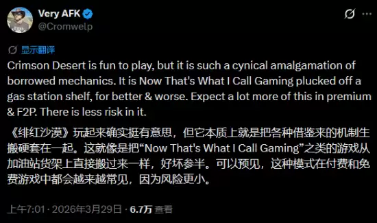 关键在于,他认为这种做法并非偶然,而可能成为一种趋势。“在他看来,这种‘拼装’模式,未来或许会更多地出现在高价3A和免费游戏中。”原因无他,就三个字:风险低。在市场不确定性增加的当下,集合已被验证过的成功玩法元素,无疑比从头探索一种全新范式要稳妥得多。