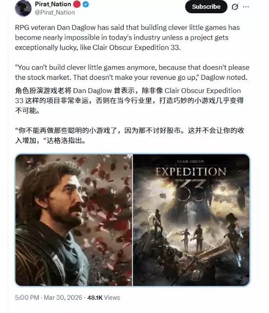 近日,游戏行业资深人士丹・达格洛发表了一番引发广泛讨论的观点。他指出,在当前的市场环境下,想要精心打造并成功推出一款高质量的独立游戏或小型作品,正变得前所未有的艰难,除非团队能获得“天时地利”般的机遇。他特别提到了《光与影:33号远征队》,并将它视为少数跨越了这一鸿沟的“幸运范例”。