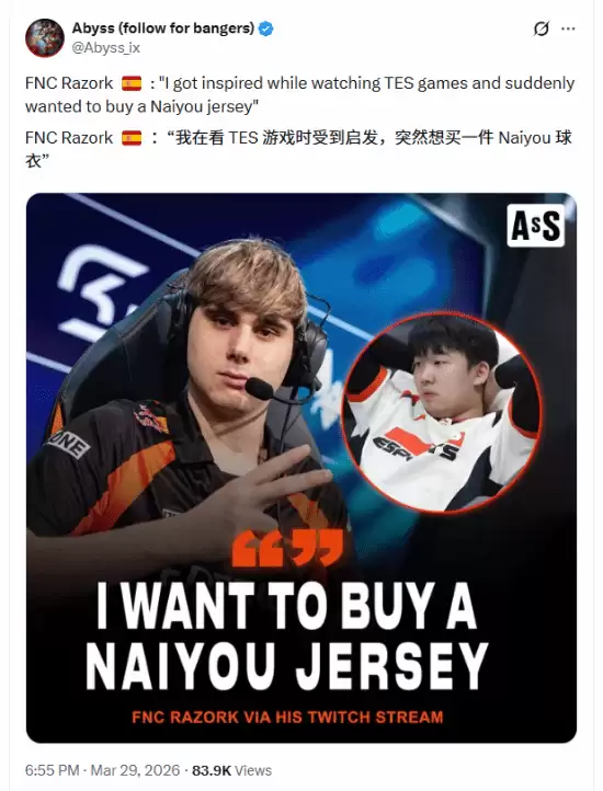 根据知名电竞博主@Abyss_jx发布的推文截图显示,Razork明确表示:“看TES的比赛让我很有启发,突然想买一件Naiyou的队服了。”这一表态因其背景特殊性,迅速成为玩家社群中的焦点话题。