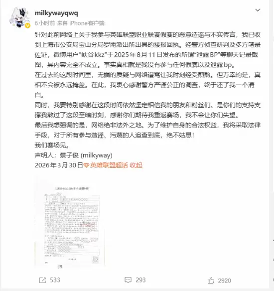 近期,上海市公安局宝山分局罗南派出所出具的一份正式接报回执,为持续近八个月的职业电竞假赛疑云画上最终句号。前LPL职业选手蔡子俊(比赛ID:Milkyway,粉丝昵称银河)通过个人微博公布了这份警方文件,正式证明所有关于其“参与假赛”、“泄露战队BP战术”的指控均属不实。根据警方详尽的侦查研判及多方调查取证,确认相关网络爆料内容纯属伪造,银河选手从未涉及任何违背职业规范或赛事规则的行为。