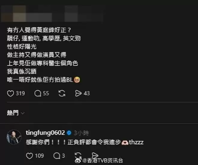 观众的真实反馈是最有力的证明。近日,有网民在社交平台发文,对黄庭锋给予了高度评价:“有没有人觉得黄庭锋非常出色?外形帅气、运动能力强、拥有高学历、英文流利、性格阳光,主持和演戏样样在行。去年看他饰演专科医生,演技令人印象深刻。唯一的遗憾大概是他还没尝试过BL题材。”这番详尽的好评迅速引发了共鸣。