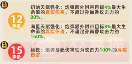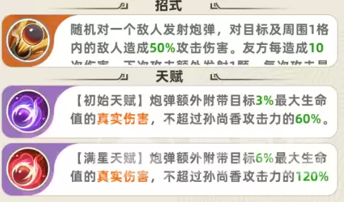 随着星级提升,孙尚香的伤害能力会产生质变。满星状态下,被动真实伤害提升至目标最大生命值的6%,并且移除了攻击力比例的上限限制,伤害潜力大幅释放。再看等级成长:达到6级时,会解锁一个进阶机制——友方每累计造成8次伤害,孙尚香的下一次普攻就能额外发射一枚炮弹(当然,仍受单次最多5枚的限制);12级时天赋升级,基础炮弹附带的真实伤害提升至目标最大生命值的4%,上限也同步提高到攻击力的80%;满星后,这个数值会进一步强化为8%,上限达到攻击力的160%。