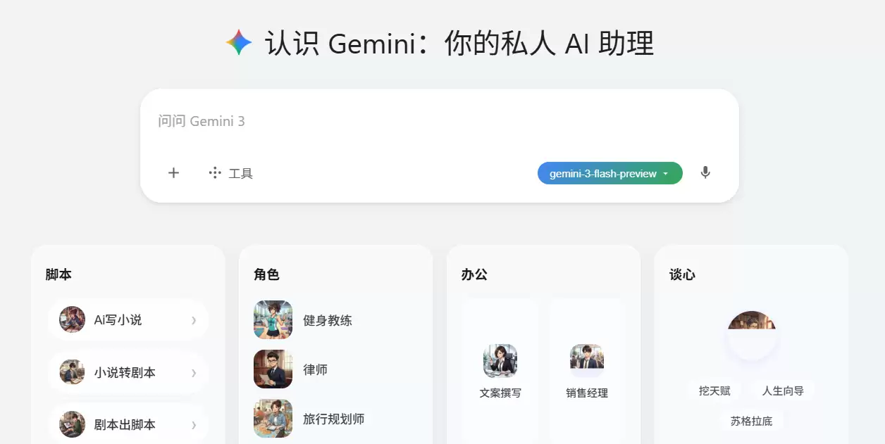 第二步:选择模型。 留意页面顶部的模型切换按钮,点击它,从列表中选择“Gemini 3 Pro”或者最新的版本。平台很贴心地同时提供了GPT-4o、Claude 3.5等选项,方便你在同一场景下随时切换、对比不同模型的表现。
