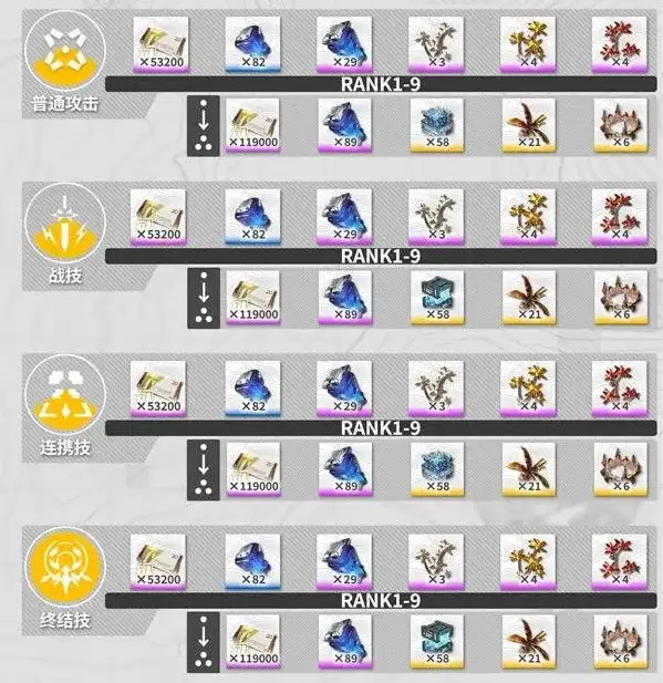 作为主C,技能等级至关重要。将一个技能升到满级9级,需要消耗: