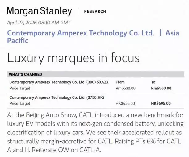 4月27日,摩根士丹利发布的一份最新研报,将市场的目光再次聚焦于宁德时代。报告指出,宁德时代在北京国际车展上亮相的凝聚态电池,无疑为豪华电动车领域树立了全新的性能标杆。这不仅将加速高端车型的电动化落地进程,更有望显著优化公司的盈利结构。基于此,摩根士丹利上调了宁德时代A股和H股的目标价,幅度均为6%,分别调至560元软妹币和695港元。