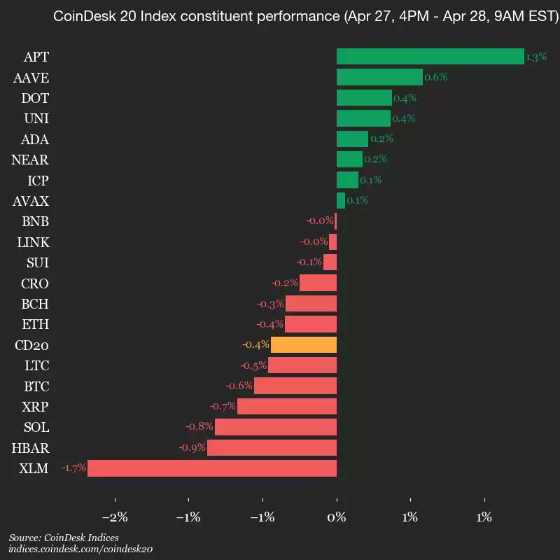 CoinDesk 20 指数表现更新:恒星币 (XLM) 下跌 1.7%,指数走低