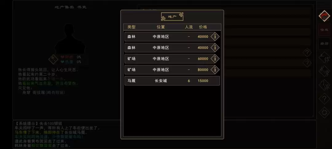 说到长安,那就必须重点提一下了。这里拥有全游戏人气最高(18点)的黄金店铺,当然,售价也高达20000银钱。这投资值不值?咱们接着看。