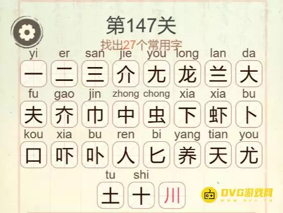 这是本关一个经典的“卡点”。很多玩家找齐26个字后,就卡在了最后一个上。其实,仔细看“龙”字的右半部分,或者将“虾”字的某些笔画重新组合,“川”字就藏在那里。它可是凑齐27个字的最后一块拼图。