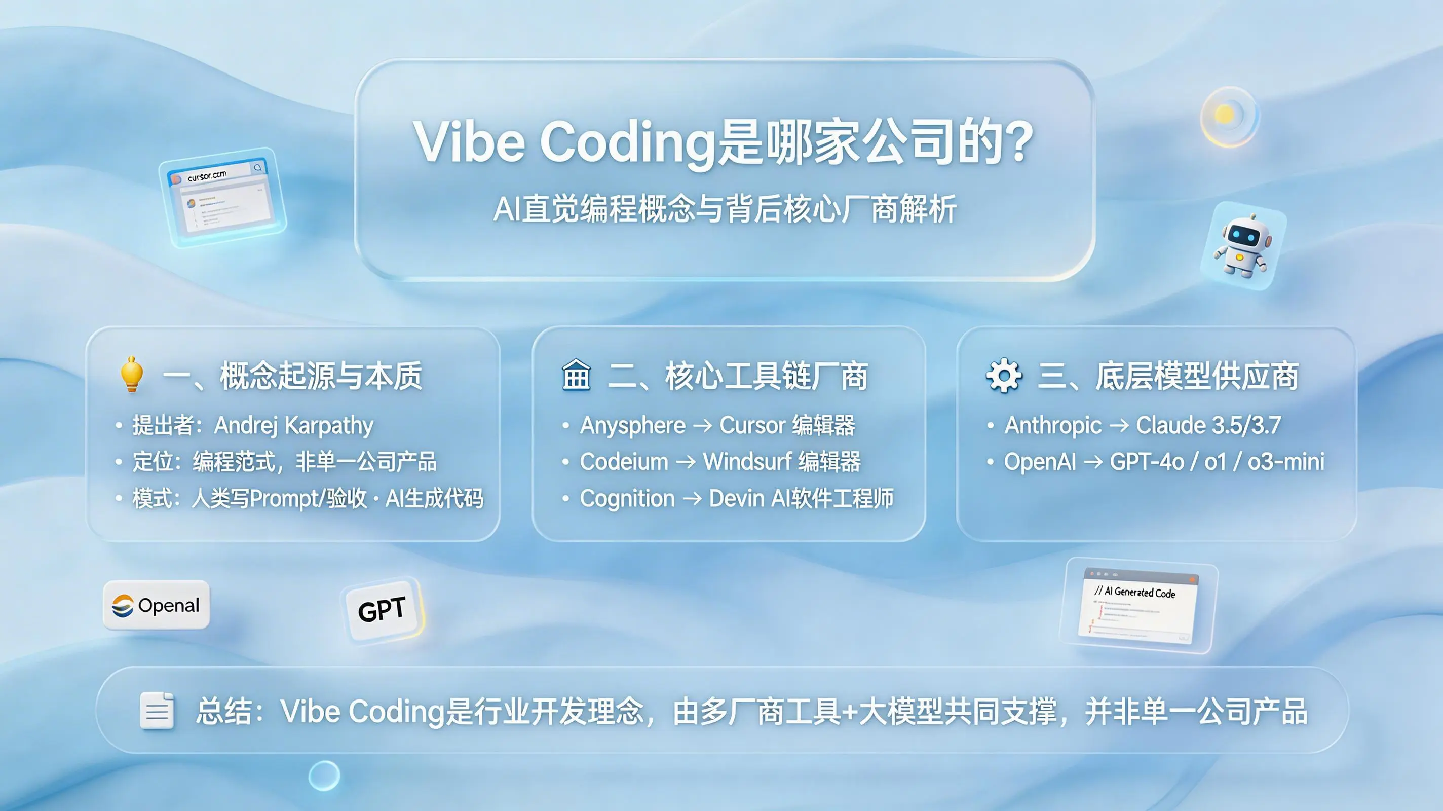 综上所述,Vibe Coding是一个源于行业先锋理念、正在被生态合力塑造的新开发范式。它的落地,离不开Andrej Karpathy等人的理念启蒙,依赖Anysphere(Cursor)、Codeium(Windsurf)等前端工具厂商的产品化工程,更最终根植于Anthropic、OpenAI等公司提供的大模型推理算力。这三者共同构成了“理念-工具-大脑”的完整价值链。