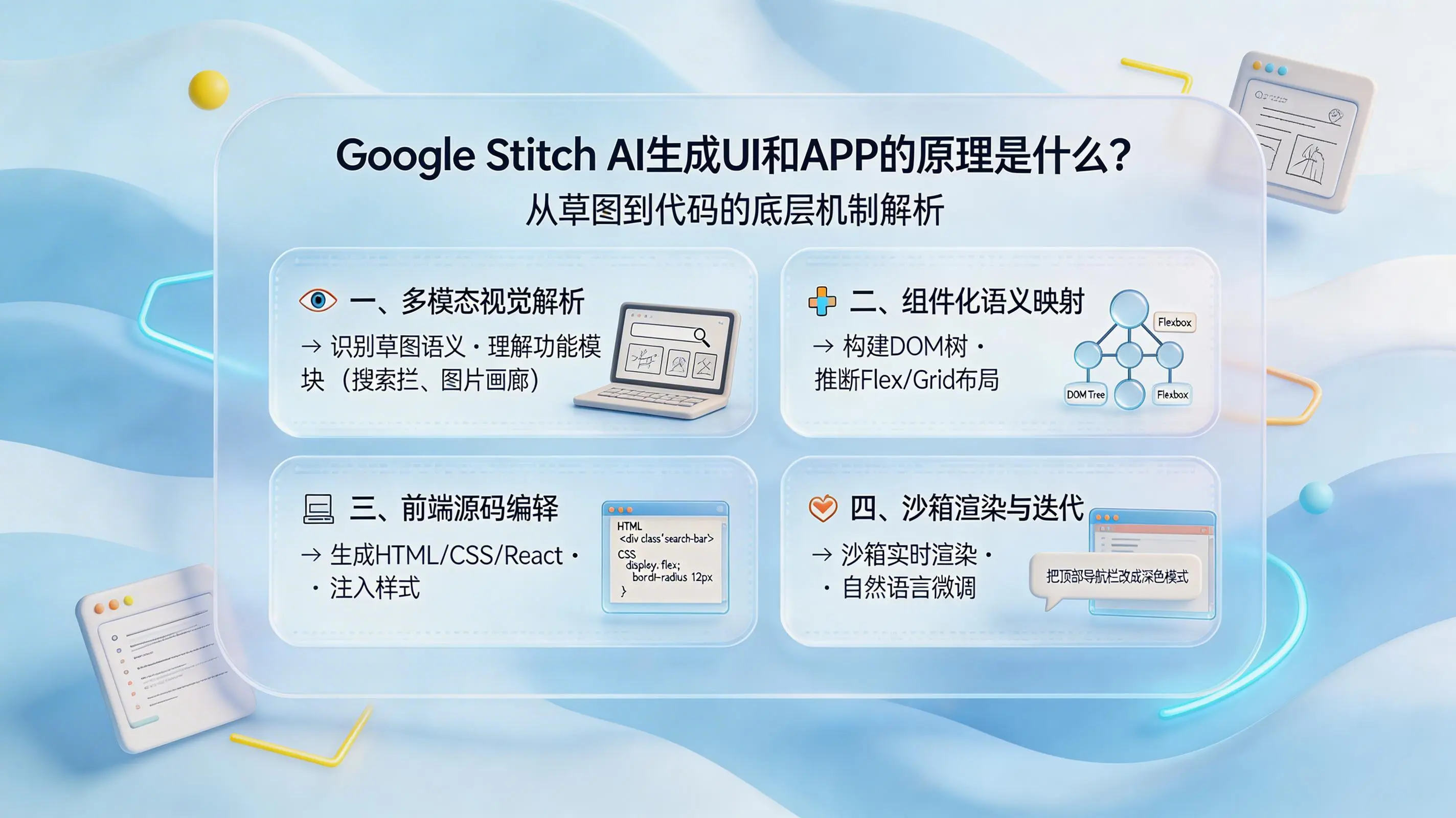 纵观Google Stitch的工作流程,它本质上构建了一套从视觉创意到数字产品的自动化编译流水线。其核心技术链路可以归纳为四个环环相扣的步骤:多模态视觉解析、组件化DOM树映射、前端代码精准编译以及沙箱实时渲染与迭代。这远非简单的图像转代码工具,而是一个深刻理解设计语义与工程逻辑的智能体。