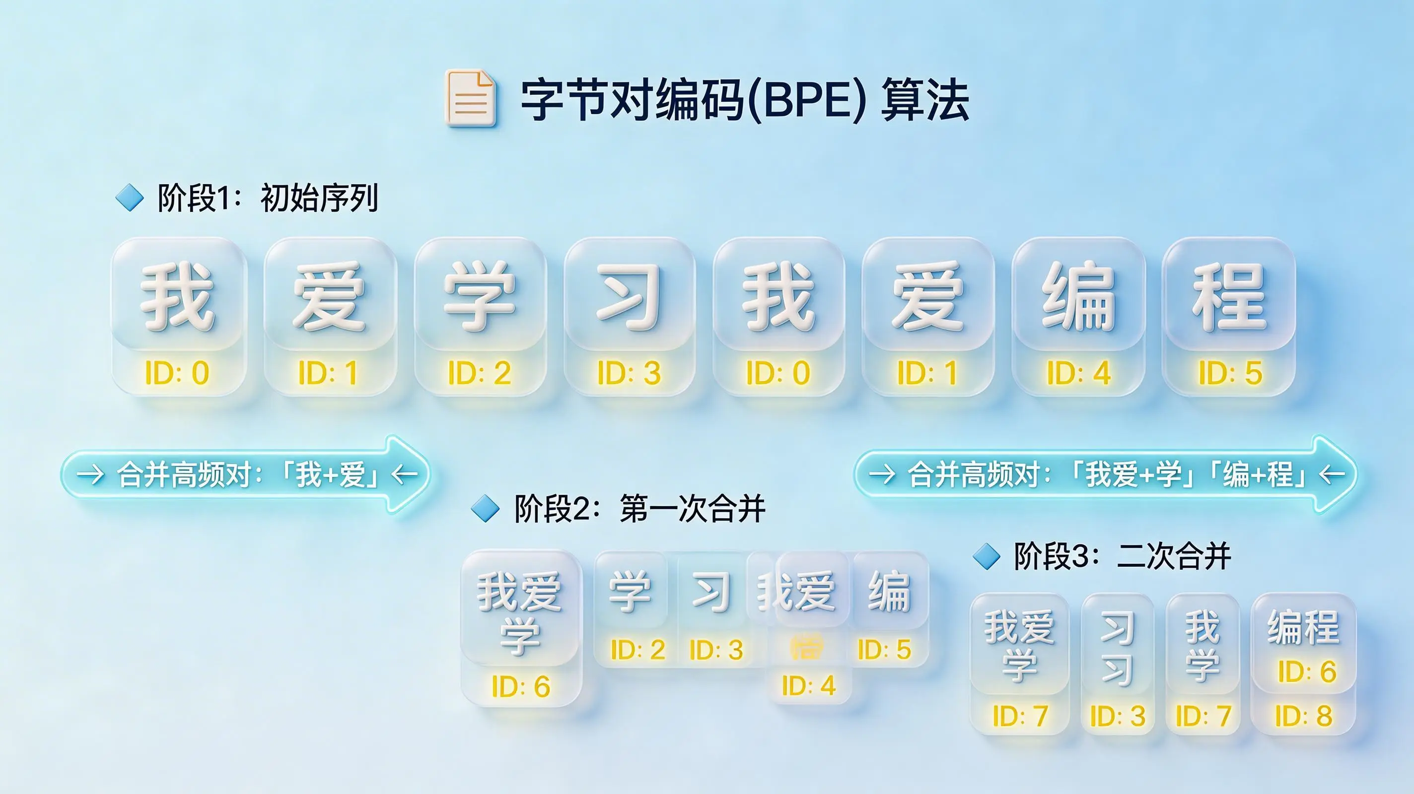 简单来说,BPE算法就像一位语言统计学家。它会先分析海量的文本语料,统计出哪些字符组合出现的频率最高。频率越高的组合,比如常见的单词或中文词汇,就越容易被定义为一个独立的Token单元。完成切分后,分词器便会将每一个Token映射到词典中对应的、唯一的整数ID上。于是,“苹果”可能就变成了3425这个数字。