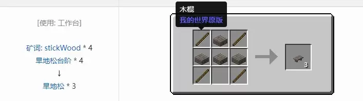 从上图可以清晰看到,你需要将特定的木板和木棍按此布局在工作台中摆放。关键在于材料的选用,必须是对应的史前自然模组中添加的“旱地松”木材,用普通的橡木或云杉木可是无法合成的。准备好材料,按照图示一步步来,一把充满荒野气息的长椅就诞生了。把它放在你的营火旁,氛围感瞬间拉满。