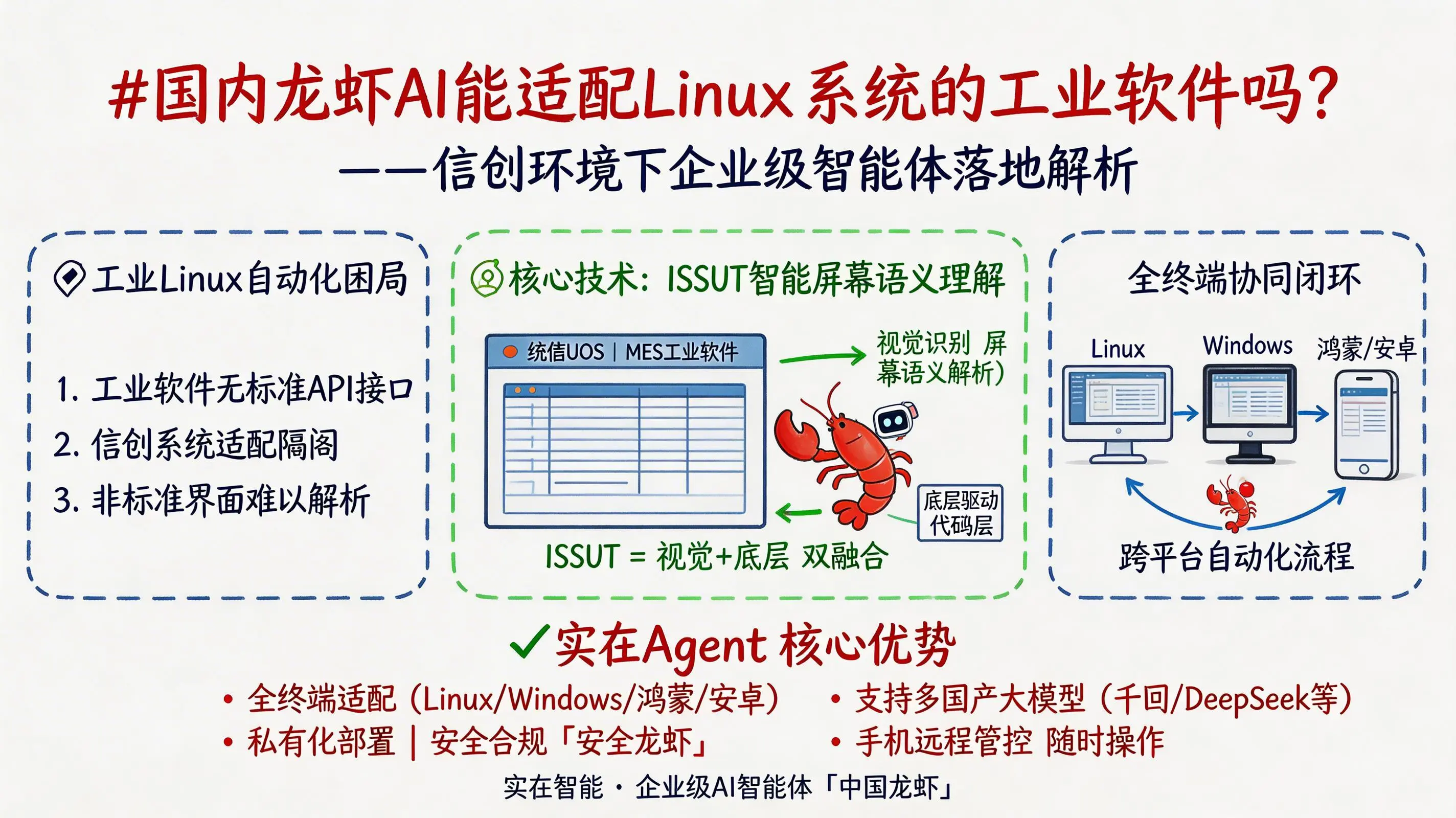 在信创国产化的大背景下,工业软件向统信UOS、银河麒麟等Linux系统迁移,已然是行业发展的必然趋势。然而,转型之路并非坦途。许多企业发现,一个巨大的“自动化断层”横亘在眼前:大量运行在Linux环境下的老旧MES、ERP、SCADA等专业系统,根本没有提供标准化的API接口。这意味着,传统的自动化工具和常规的AI智能体,面对这些系统时几乎是“望洋兴叹”,业务流程的自动化闭环无从谈起。最近,业内关于“中国龙虾”(即企业级AI智能体)能否啃下这块硬骨头的讨论,热度颇高。本质上,成熟的企业级AI助理在产品形态上与主流智能体一致,也支持API、MCP协议和多技能调度,契合多智能体协同的先进架构。但关键在于,谁能真正实现工业场景下那“临门一脚”的实操能力,而国内顶尖的技术方案,似乎已经找到了突破口。