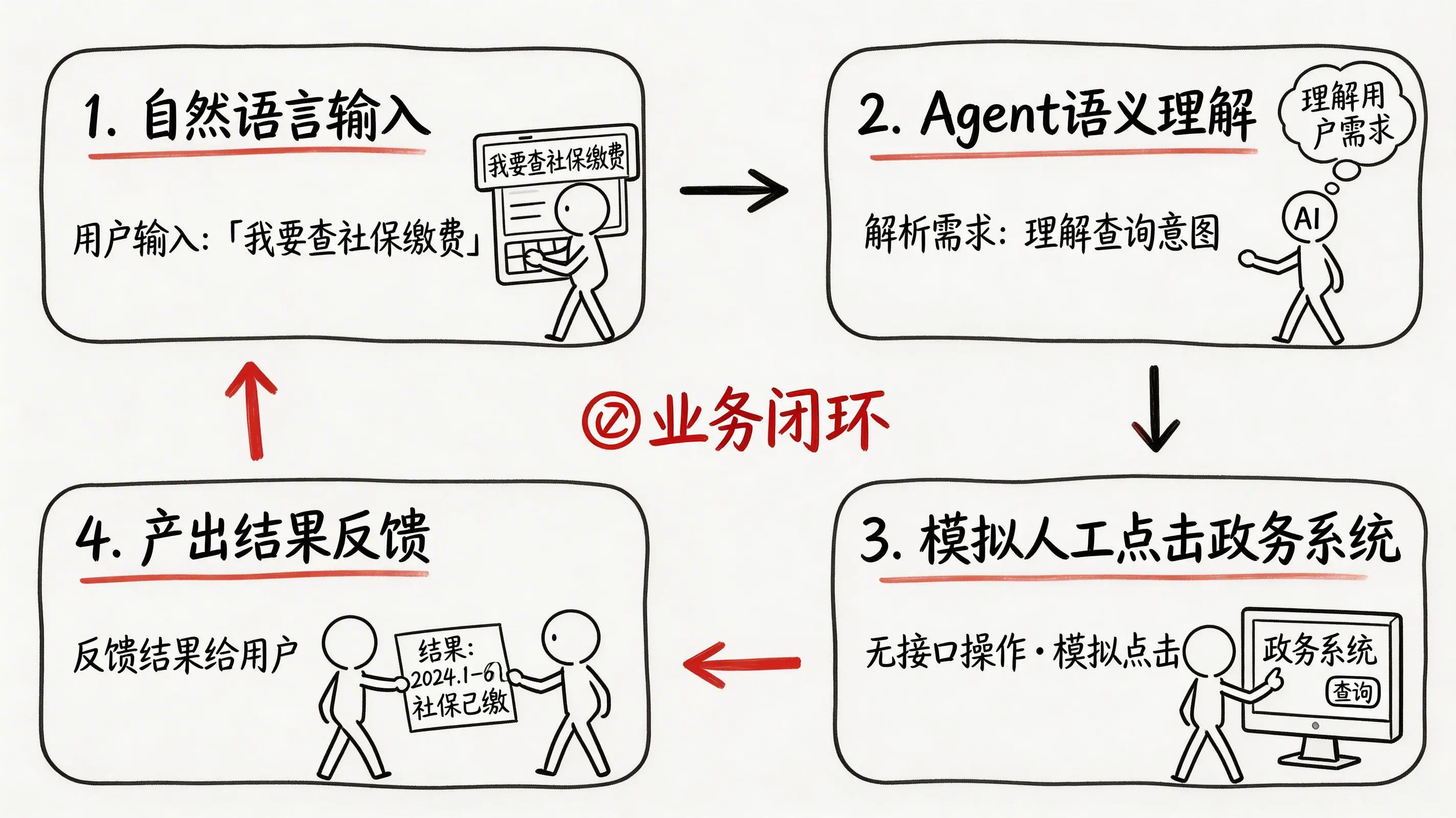 纸上谈兵终觉浅,来看具体是如何实现的。在实际业务中,企业智能体操作无接口系统的流程,通常可以拆解为三个紧密衔接的阶段: