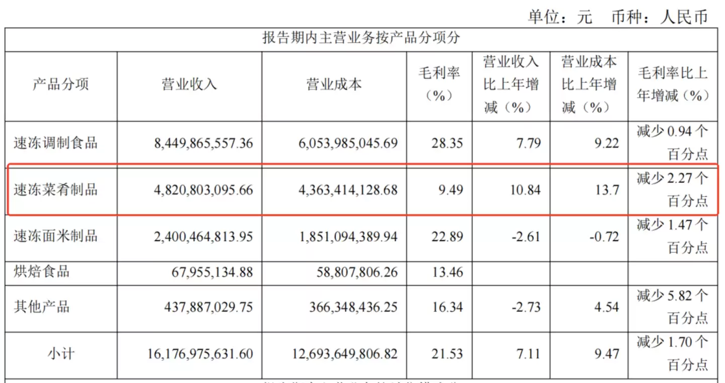 2025年,该板块营收同比增长10.84%至48.21亿元,占总营收比重已近三成(29.77%)。但问题在于,其毛利率同比再降2.27个百分点,仅剩9.49%,远低于速冻调制食品的28.35%和速冻面米制品的22.89%。