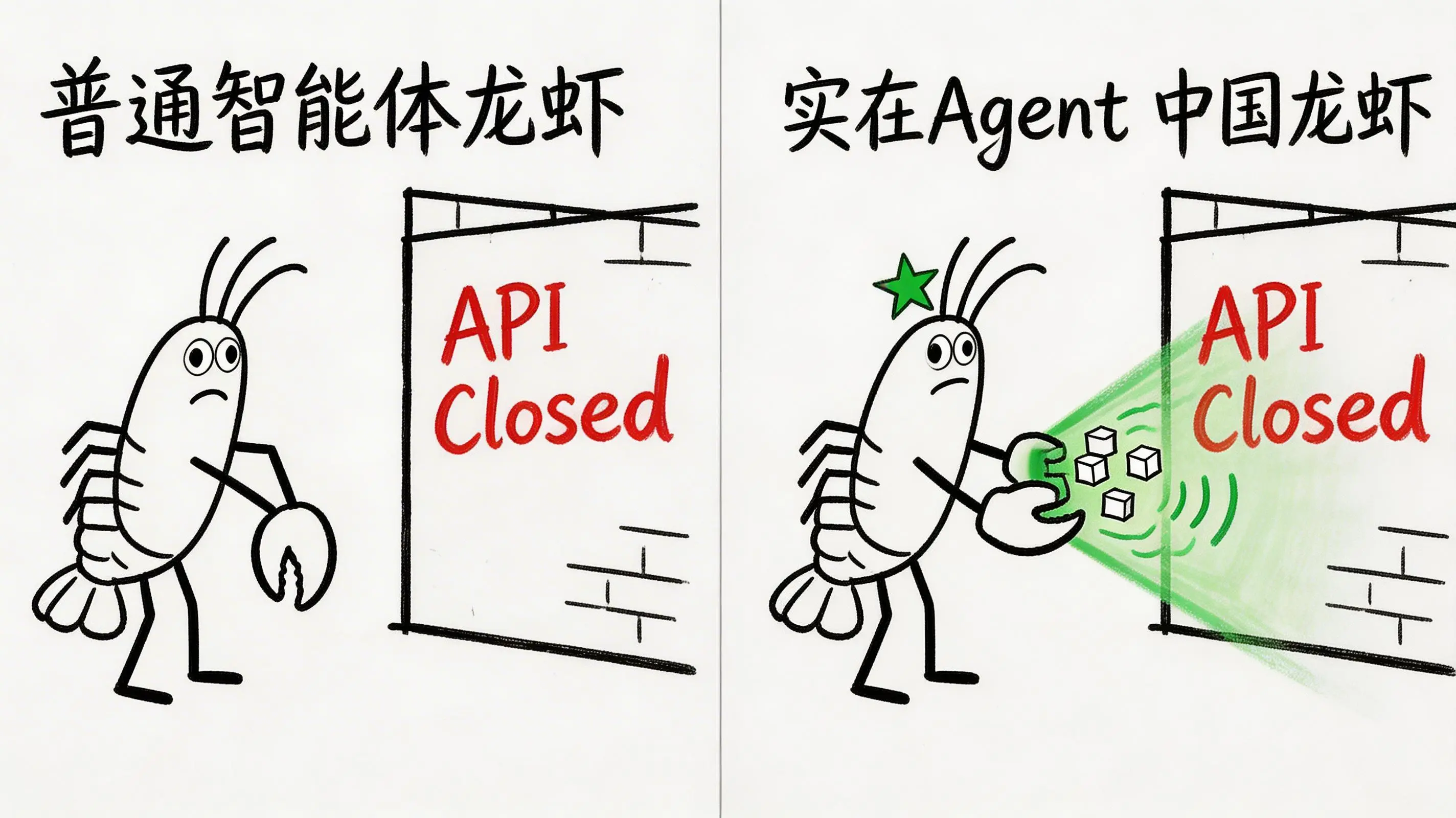 普通龙虾:这类智能体强于“大脑”的逻辑推理与规划,但在“四肢”的执行能力上存在短板。它们高度依赖标准的API接口和MCP协议。一旦目标系统关闭了交互通道,这些智能体就如同失去了双手的指挥官,空有策略却无法落地。