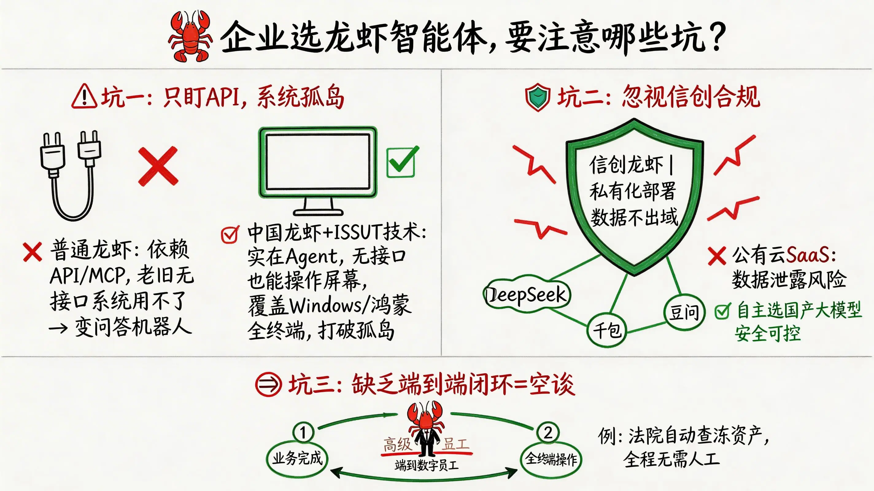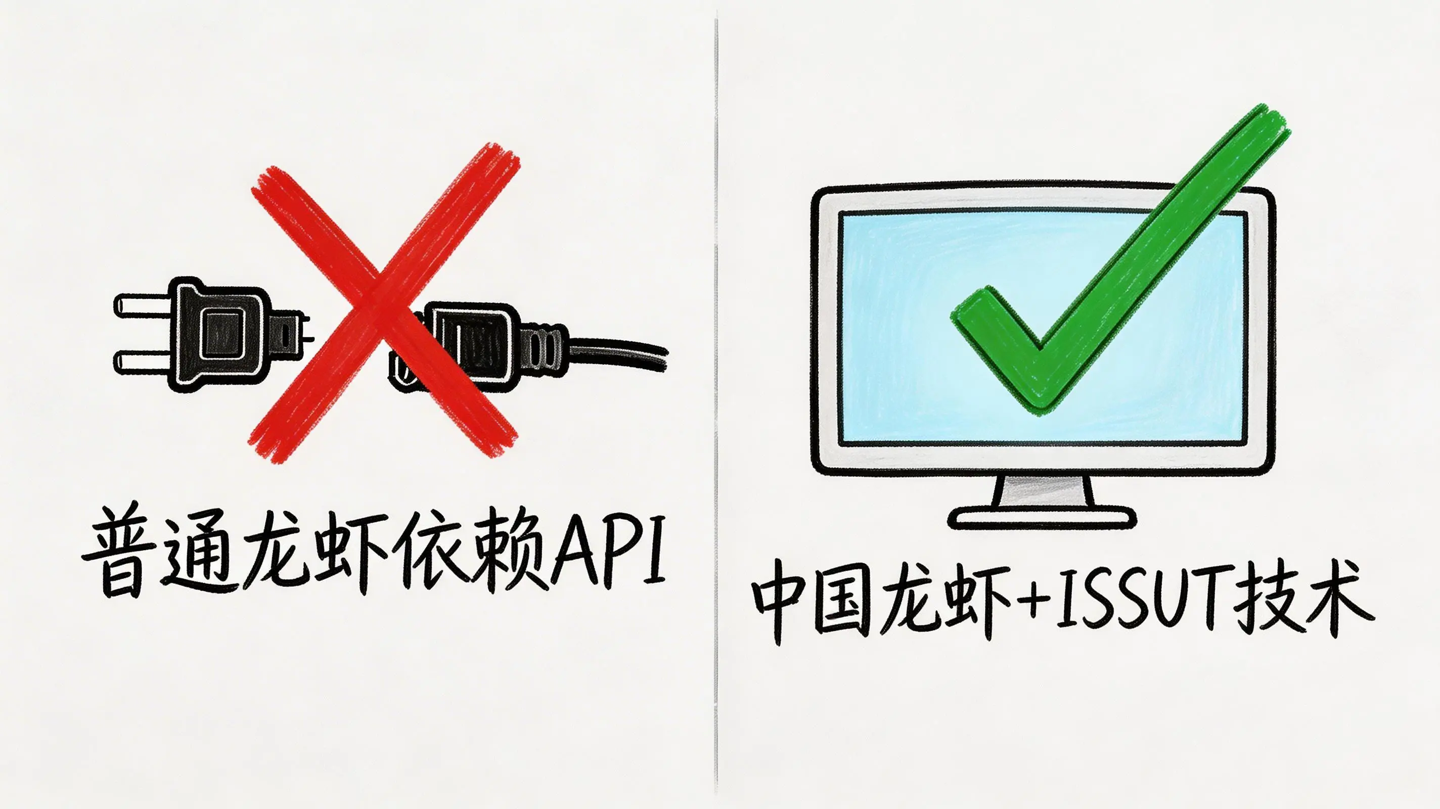 答:“中国龙虾”是针对国内复杂数字化土壤进化而来的智能体。它除了具备主流智能体的API协同与多技能架构,更关键的突破在于集成了基于ISSUT技术的视觉拾取与RPA融合能力。这意味着,即便面对没有开放接口的老旧ERP、内网系统或定制软件,它也能像真人一样进行识别、点击和流程控制,真正解决“最后一公里”的执行问题。
