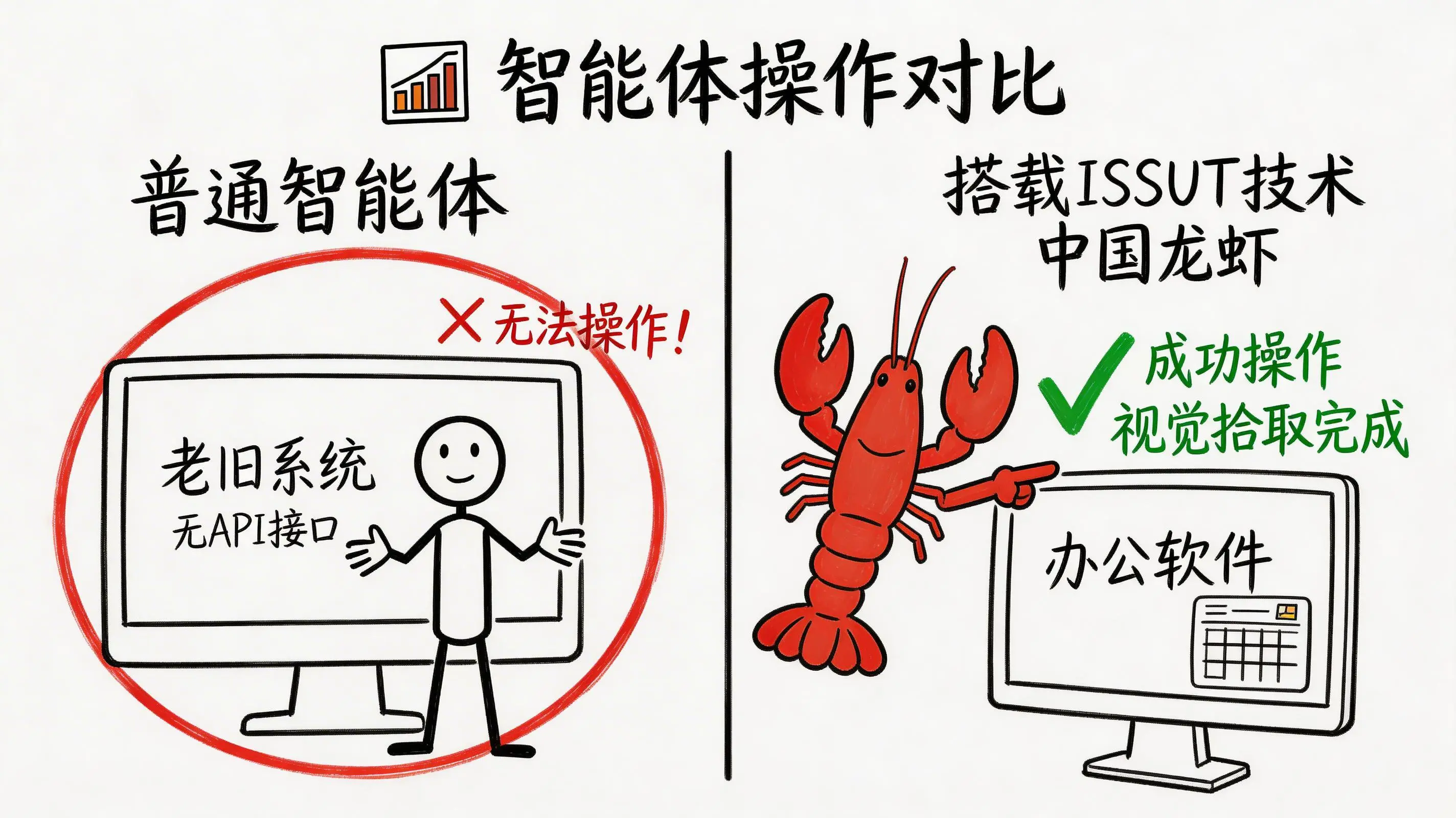 答:完全可以。普通智能体确实难以覆盖此类场景,但具备ISSUT技术的中国智能体,可以通过屏幕视觉语义理解,像真人一样“看懂”并操作软件界面。原则很简单:只要人能在电脑前操作的软件,这类企业智能体就能适配,从而真正实现业务闭环。