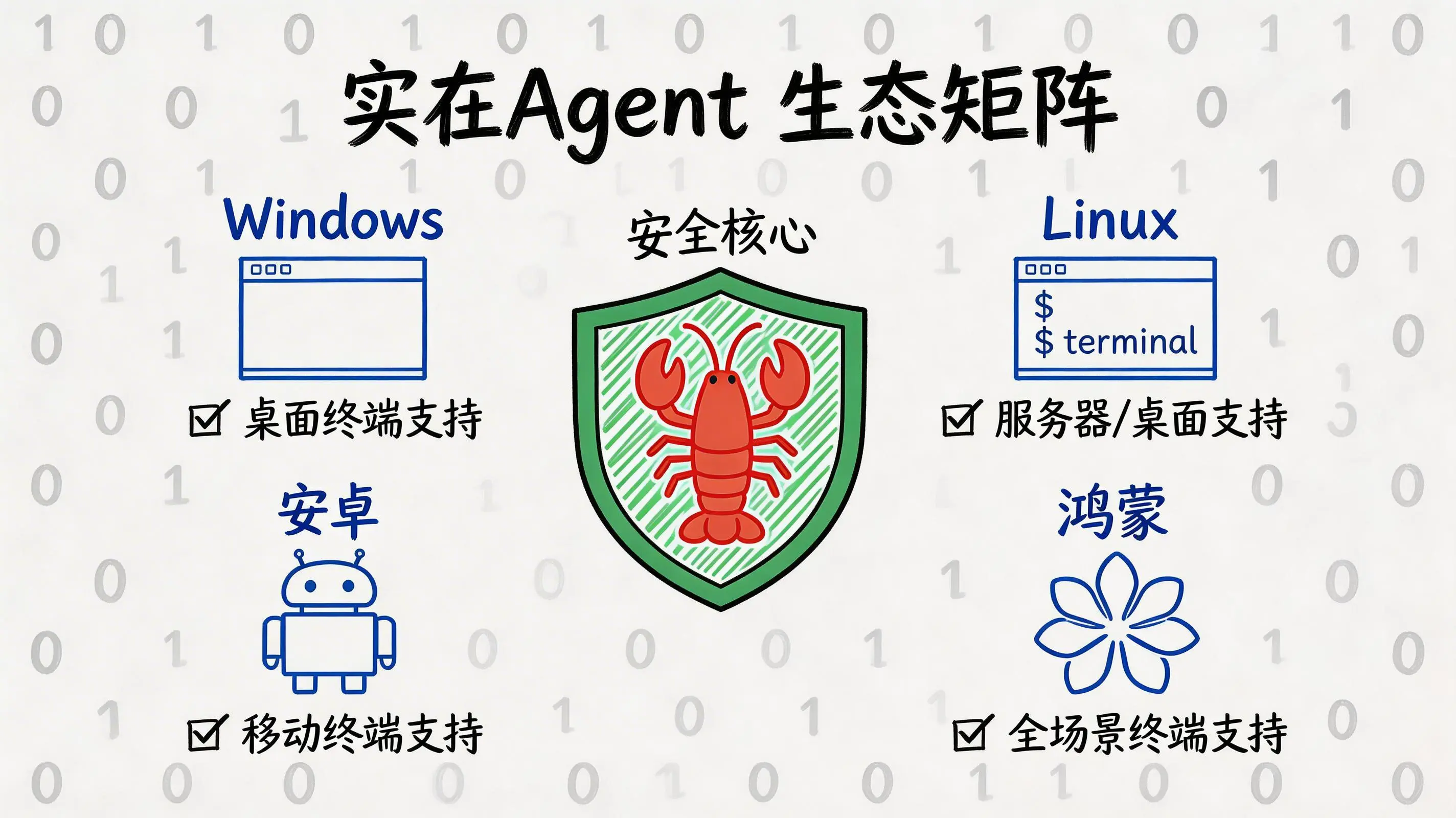 业务场景往往分布广泛,从Windows办公电脑、Linux服务器,到安卓或鸿蒙手持终端,都可能涉及。一个优秀的、符合信创要求的智能体,必须具备全终端适配能力。据了解,实在Agent已实现了对Windows、Linux、安卓、鸿蒙的全终端覆盖(Mac端支持也在规划中),确保了业务流程在不同端侧的连续性与一致性。