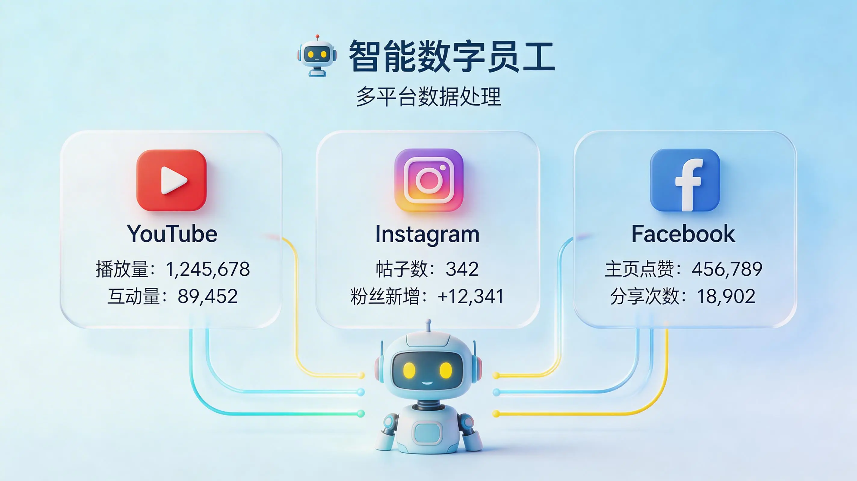 解决方案: 引入实在智能的自动化方案,构建了一个能够自动抓取、解析并存储全平台视频曝光量、点赞数、评论内容等关键数据的智能流程。