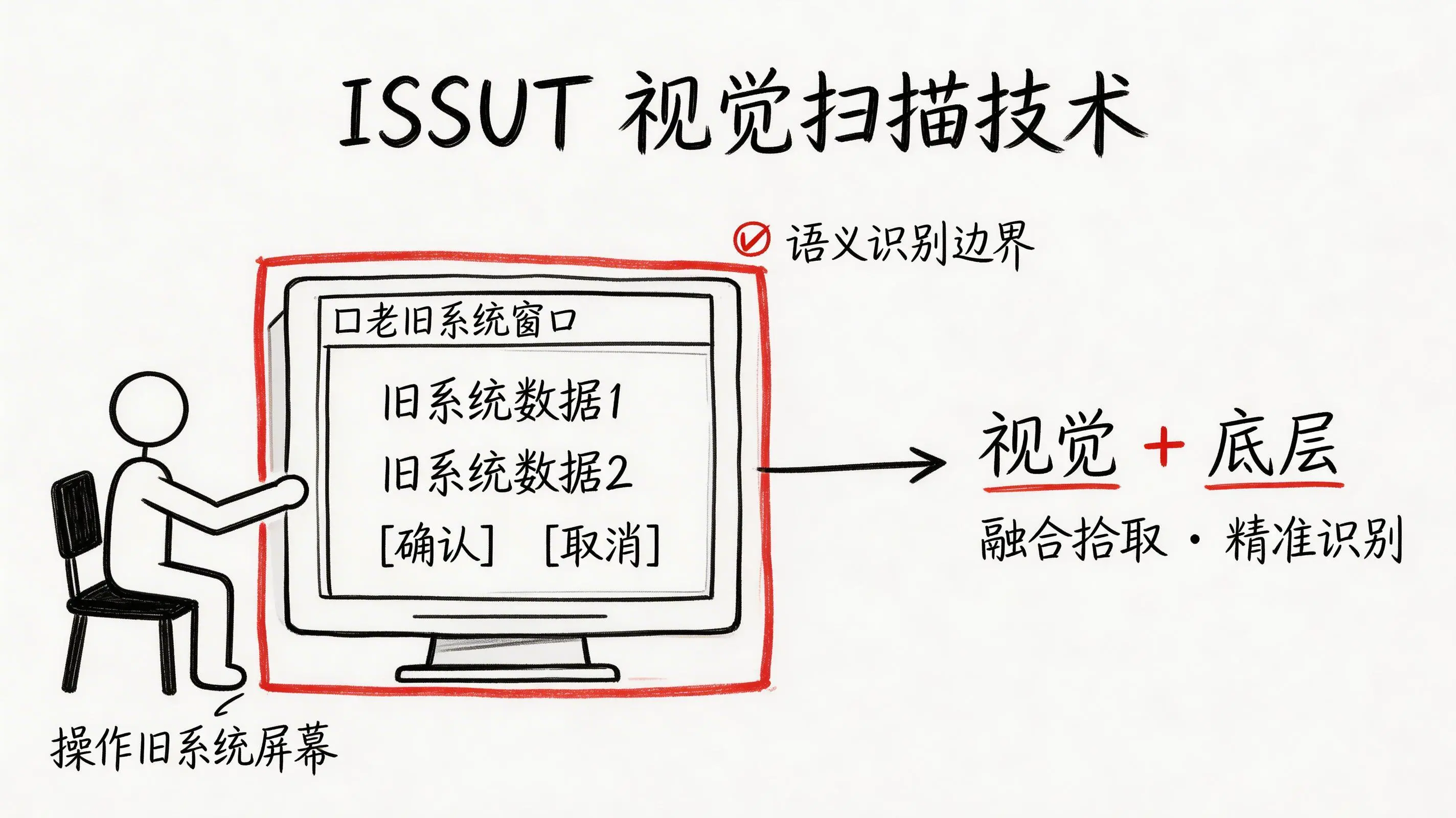 问题的关键就在这里。实在Agent之所以不同,在于其搭载了独有的ISSUT智能屏幕语义理解技术。这项技术赋予了它一种更接近人类员工的能力——“看懂”屏幕。通过“视觉分析+底层指令”融合的RPA增强能力,它能够识别软件界面上的元素,并模拟人类进行点击、输入等操作。