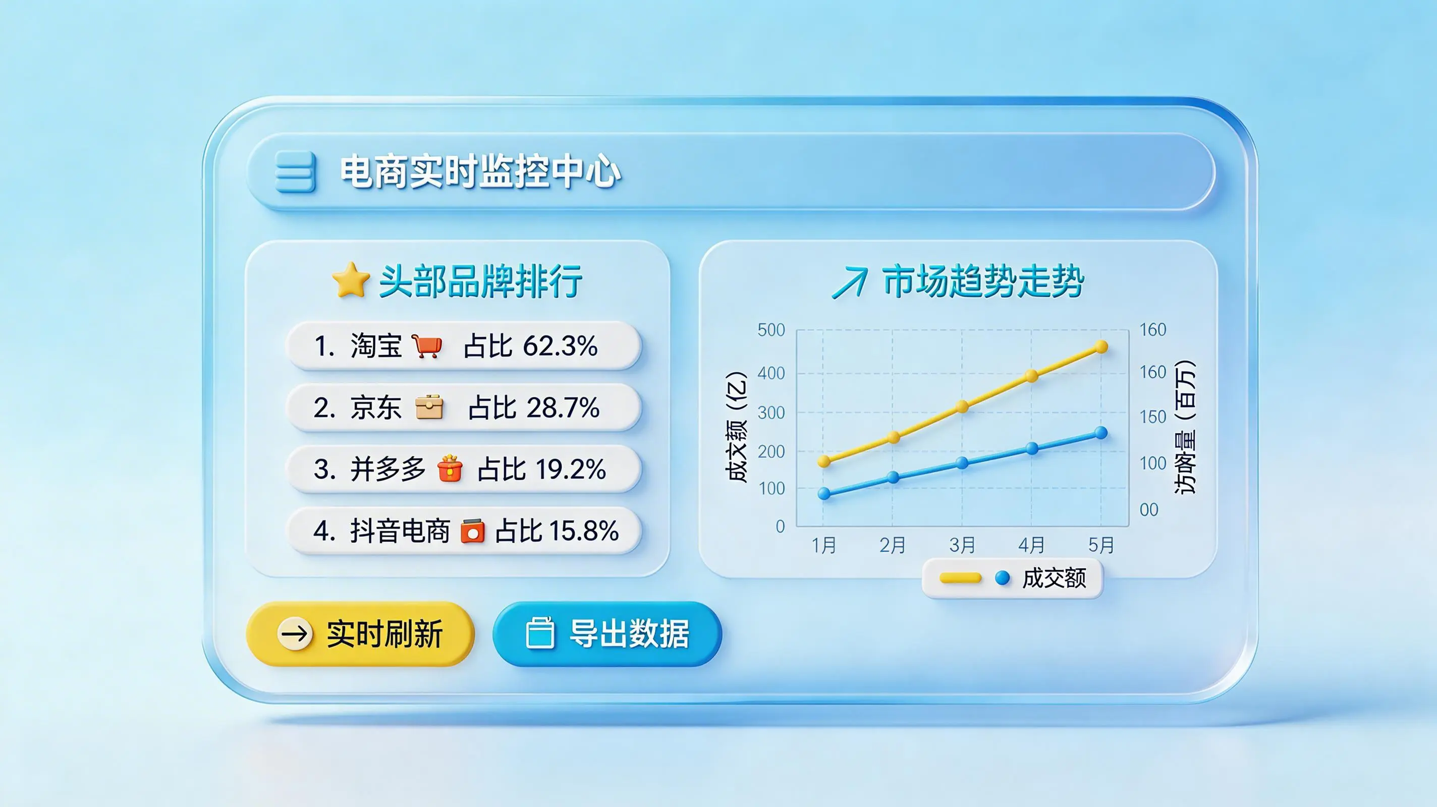 这具体体现在两方面:一是市场大盘趋势分析。通过跨周期采集“生意参谋”、“英敏特”等权威平台的数据,系统能够自动挖掘出特定类目(比如美妆或家居)的行业红蓝榜及增长曲线,让你快速看清风口在哪、风险在哪。二是竞品动态实时追踪。定时抓取对手的价格策略、销量波动和促销节奏,并生成一目了然的竞争格局图,让对手的动向尽在掌握。