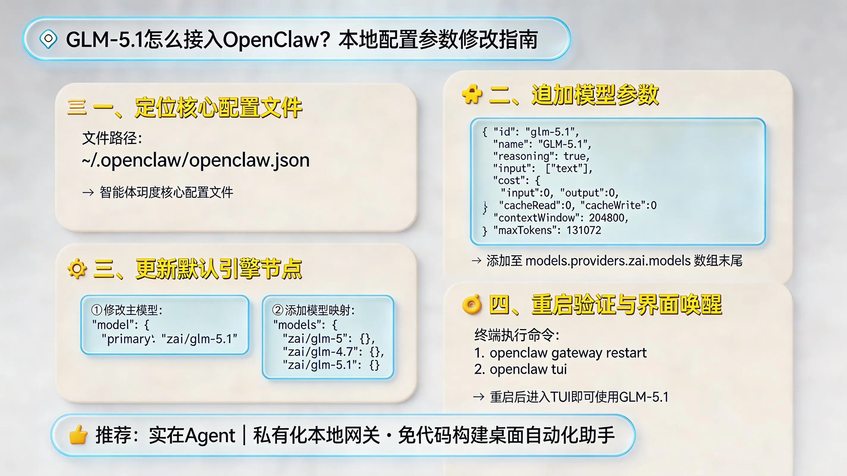 以上就是将 GLM-5.1 接入 OpenClaw 智能体框架的完整本地配置流程。整个过程围绕着编辑核心 JSON 配置文件展开,依次完成了新模型的参数注册、默认引擎的切换指派以及路由映射的补充。最终,通过一次网关重启,即可在本地环境中顺畅调用 GLM-5.1 的高阶推理能力,从而显著提升桌面自动化的逻辑处理上限。