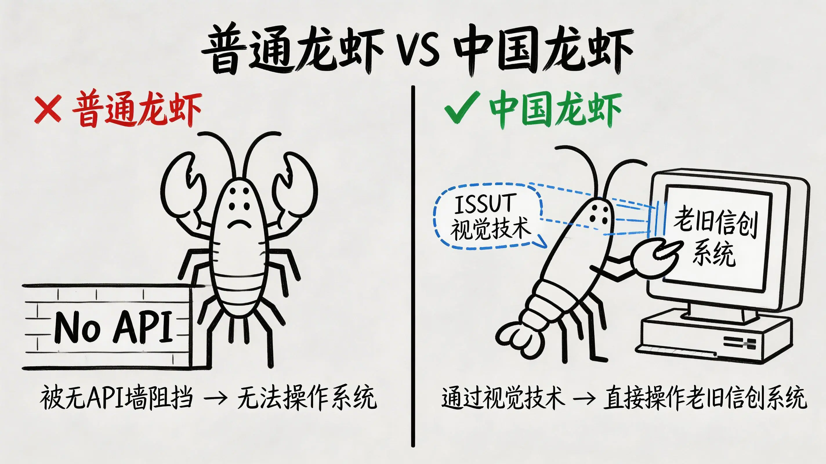 “中国龙虾”是一个行业比喻,特指那些符合信创要求、具备自主知识产权的企业级AI智能体。与普通智能体相比,中国龙虾(例如实在Agent)在信创环境下的适配能力更为突出,并且独家拥有基于ISSUT技术的视觉识别能力,能够操作那些没有API接口的软件,从而真正实现跨终端的业务闭环。
