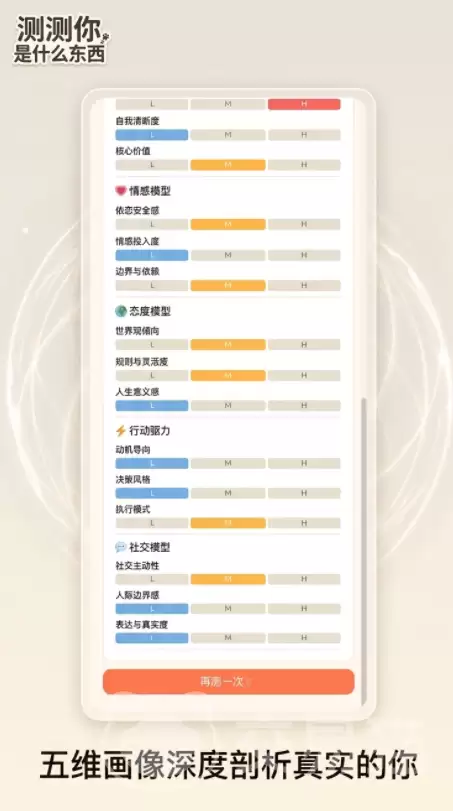 在操作层面,这款游戏可以说是零门槛。它无需复杂的角色操控,没有资源积累的负担,摒弃了PVP对抗,也不设体力限制。玩家需要做的,仅仅是专注于每一道题目,选择那个最贴近当下直觉的选项。系统后台会自动过滤那些表面合理但内在冲突的答案,以确保最终输出结果具备可靠的行为学参考价值。所有题目均经过严谨的信效度校验,从而保证五个维度的评分具备跨情境的稳定性与良好的个体区分度。说到底,它提供的是一个纯粹的内观窗口,让认识自己这件事,变得像游戏一样可以轻松开启。