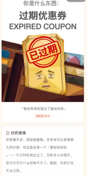 完成全部测试后,真正的洞察才开始。系统会从自我认知、情感调节、行动执行、态度取向、社交适应这五大维度,分别输出量化评分。但比分数更引人深思的,是随之生成的、唯一匹配的象征性物品。请注意,这个物品绝非随机分配,而是严格对应你的答题数据所反映出的行为惯性与心理特质。举个例子:“角落中的蜘蛛网”可能指向低环境期待与延迟启动的倾向;“灭火器”则常常映射出高责任敏感度与危机响应优先级的思维模式;而一张“过期优惠券”,或许揭示的是决策滞后性与机会成本意识的薄弱环节。每一件物品都附有详细的行为溯源说明,引导玩家回溯真实生活场景中的对应表现,这种关联性设计,正是其洞察力的关键所在。