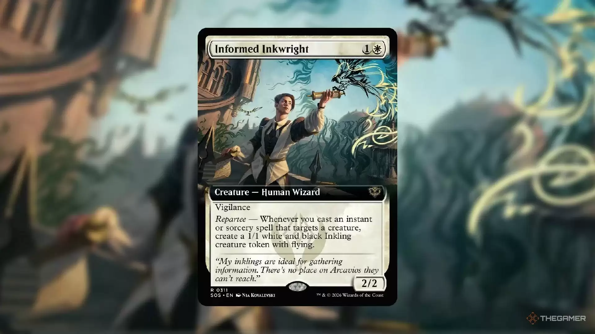 接下来是这张费用低廉的2/2警戒生物——Informed Inkwright。它简直是为Orzhov(黑白)套牌量身定做,其“妙语”异能意味着:每当你施放一个以生物为目标的咒语时,就能创建一个1/1且具飞行异能的黑白墨灵衍生物。