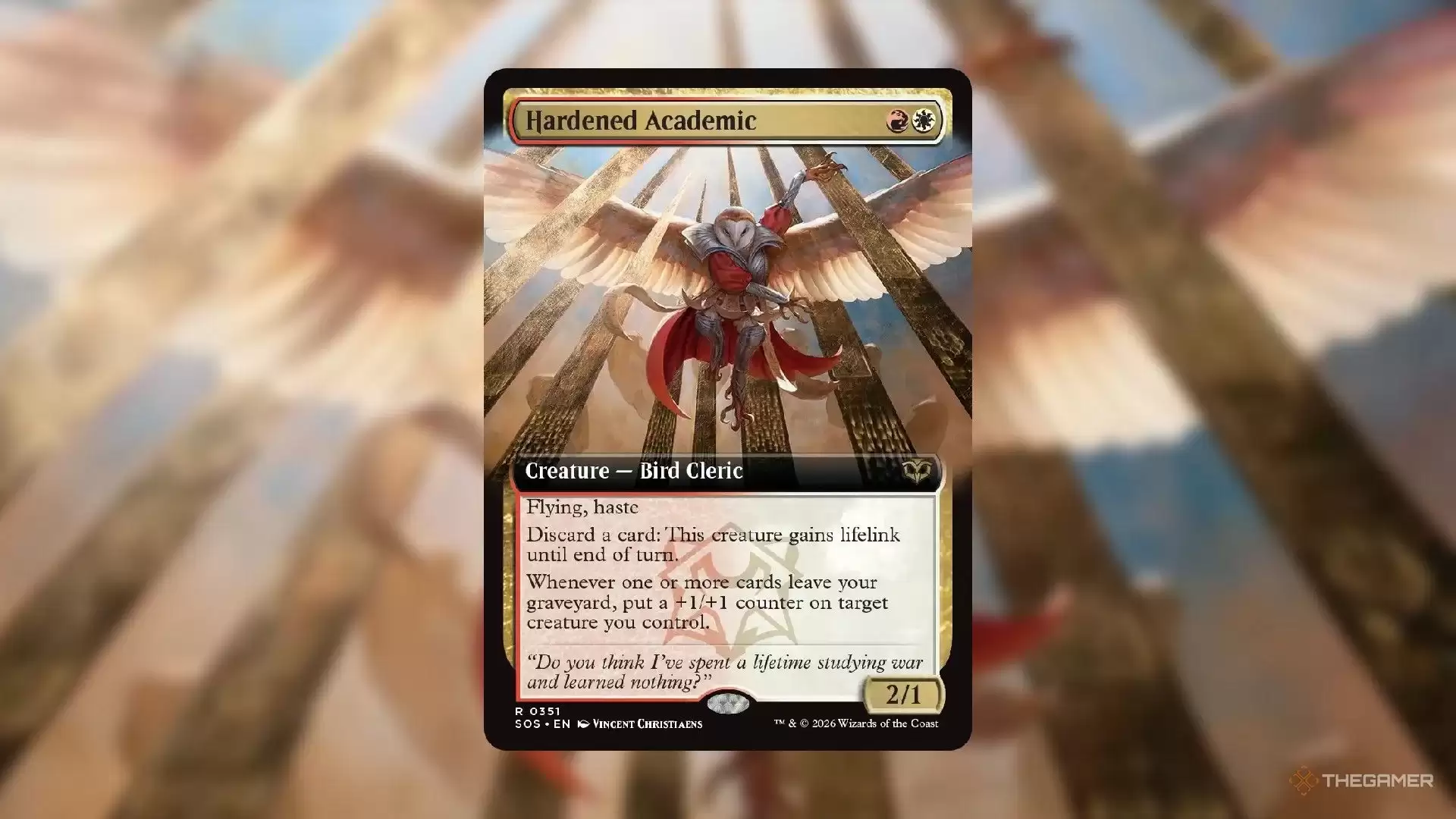 Lorehold学派中有不少在轮抽早期就值得抓取的限制赛强牌,而Hardened Academic无疑是其中最强力的一张。这个两费的鸟类牧师,天生就具有飞行和敏捷这两大进攻异能。