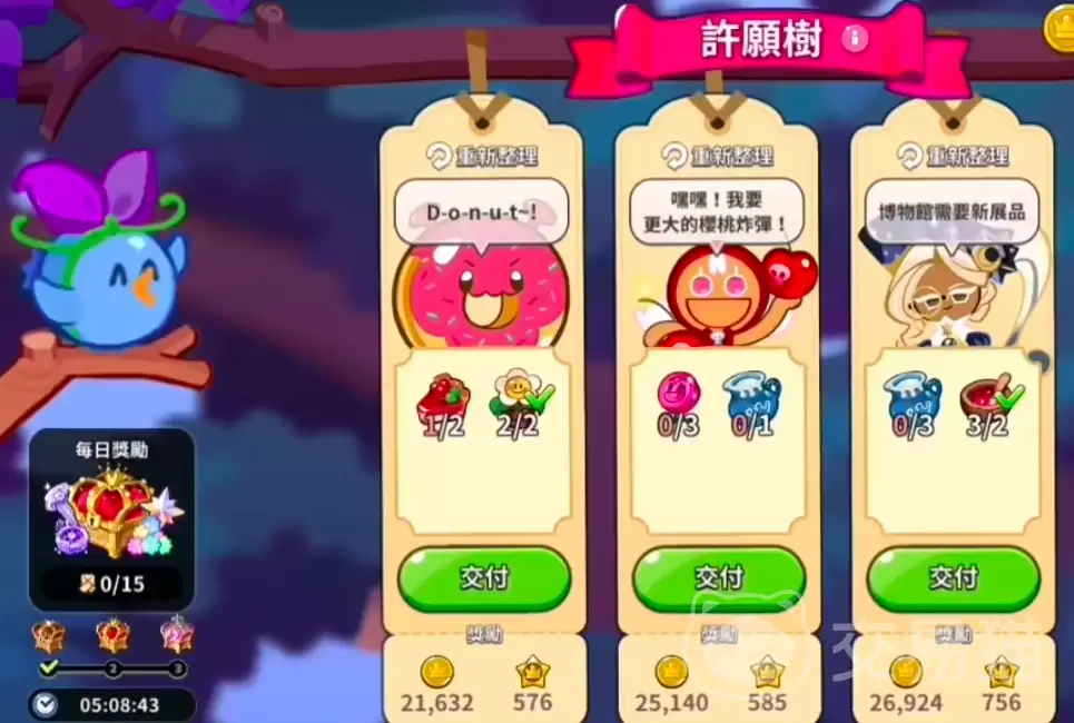 除了碰运气,还有一条更稳定的核心获取路径——许愿树兑换系统。操作起来也不复杂:在地图上和蓝莓鸟接触后,点击它就能跳转到许愿树界面。接下来,你需要根据蓝莓鸟发布的订单要求,提交对应的材料。完成交付后,专属宝箱就能到手了。目前许愿树列表里可兑换的物资包括草莓酱、牛奶、樱桃棒棒糖、幸福花等固定品类,每完成一个订单,就对应领取一个宝箱奖励,而且没有重复领取的限制,只要材料够,就能一直换。