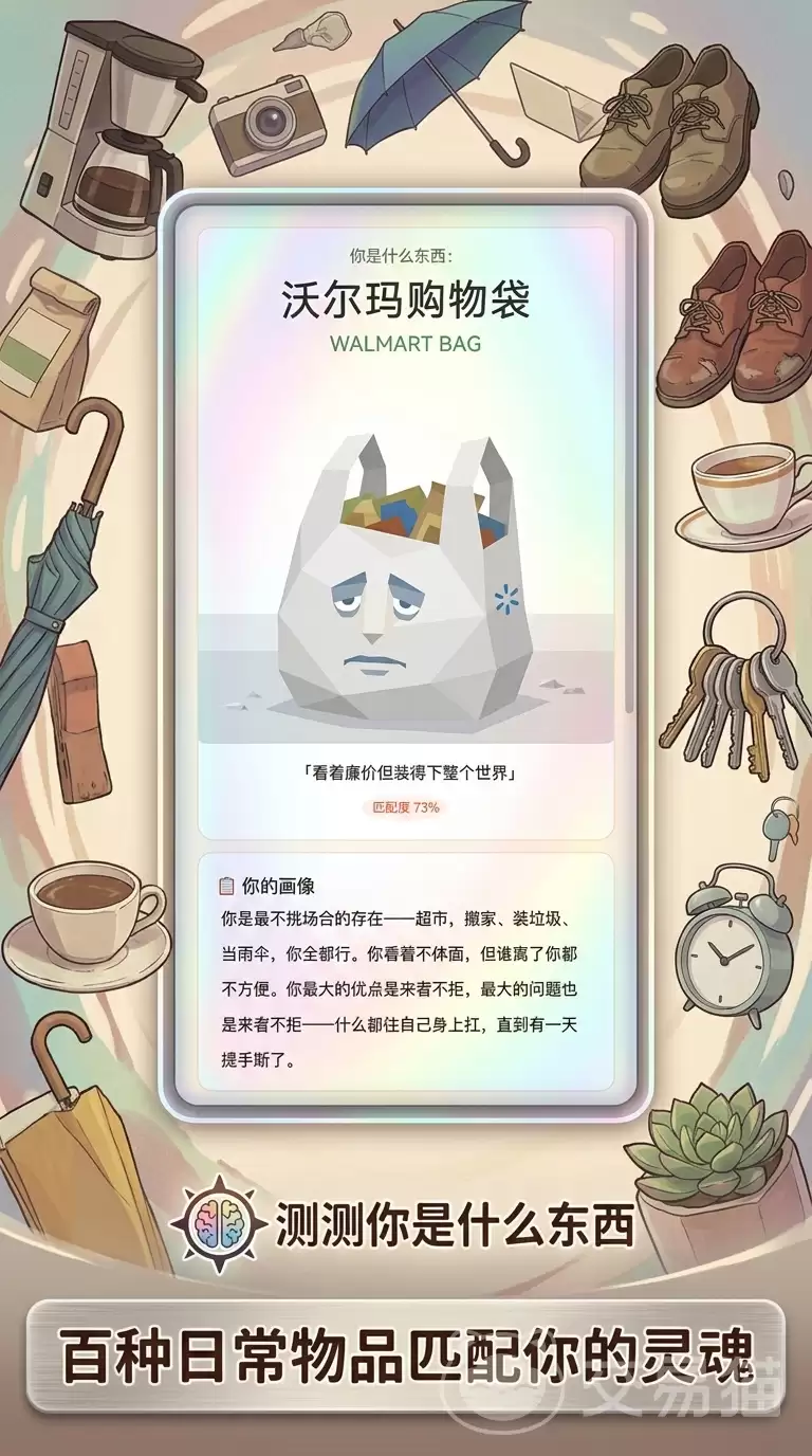测试结果并非简单的好坏判定,而是基于多维选项组合生成。游戏一共设计了27种差异化的物品人格标签,比如“拿捏者”、“卧草人”、“多情者”等等。这些标签命名本身就充满了网感张力和情绪共鸣点。