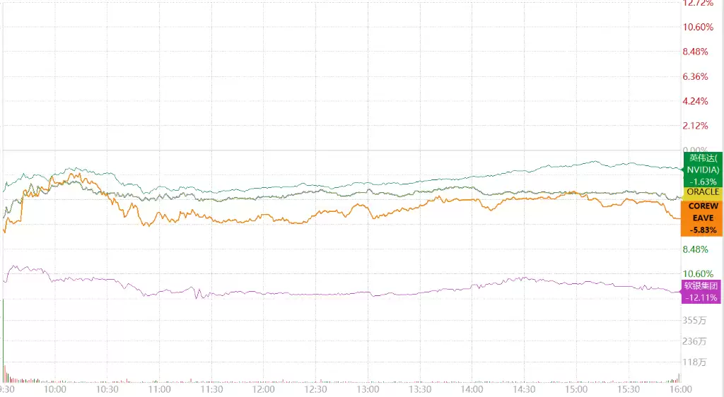 (英伟达、甲骨文、Corewea ve和软银ADR日内走势疲软)