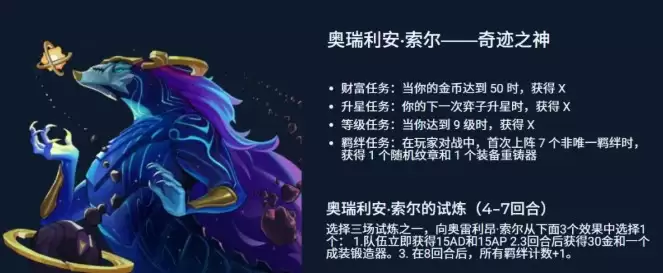 羁绊强化型阵容:想追求九德玛、九恕瑞玛这样的顶级羁绊?“奥瑞利安·索尔”是你的最佳伙伴。通过完成他布置的财富积累、英雄升星或激活羁绊等任务,你将有机会获得随机的纹章之书、装备重铸器等稀缺资源,极大增加了凑出高阶羁绊的可能性。