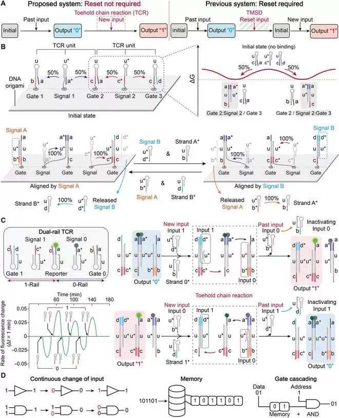 然而,理想很丰满,现实却曾很骨感。传统的DNA电路有一个致命的“一次性”缺陷:DNA链在发生杂交或酶促反应后,通常就被消耗或永久改变了。这意味着系统只能运行一次,完成简单的检测后便宣告终结,既无法进行连续运算,更谈不上存储信息。这就像一台计算机每次开机只能执行一条指令,然后就必须彻底重置,其应用前景因此大受限制。