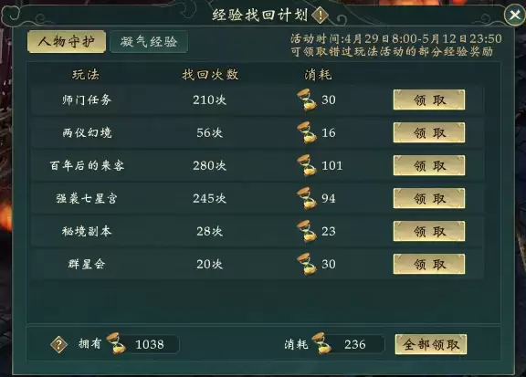 (2)使用时光沙漏,可以找回活动期间错过的每日玩法所对应的部分人物、守护及凝气经验。