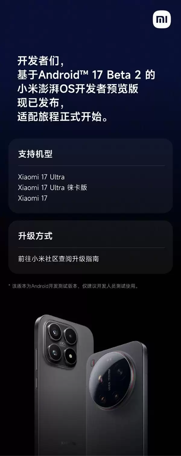 基于安卓17 Beta 2 小米澎湃OS开发者预览版发布:支持小米17等三款机型