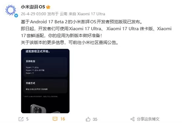 4月29日,小米澎湃OS官方发布消息,基于Android 17 Beta 2的开发者预览版现已正式推出。对于热衷于前沿技术的开发者而言,这无疑是一个重要的尝鲜机会。
