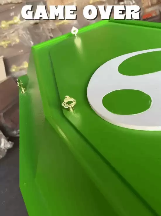 从设计上看,这几款棺材并没有采用直白的游戏画面印刷。相反,它们走的是“色彩暗示”路线:马里奥与奇诺比奥是标志性的红色,路易吉是清新的绿色,碧琪公主是温柔的粉色,耀西则是明亮的浅绿色。每款棺木上还可以安装木质铭牌来进一步区分具体角色。这种相对克制的设计,颇有些“圈内梗”的味道——懂的人自然懂,无需过多解释。