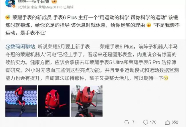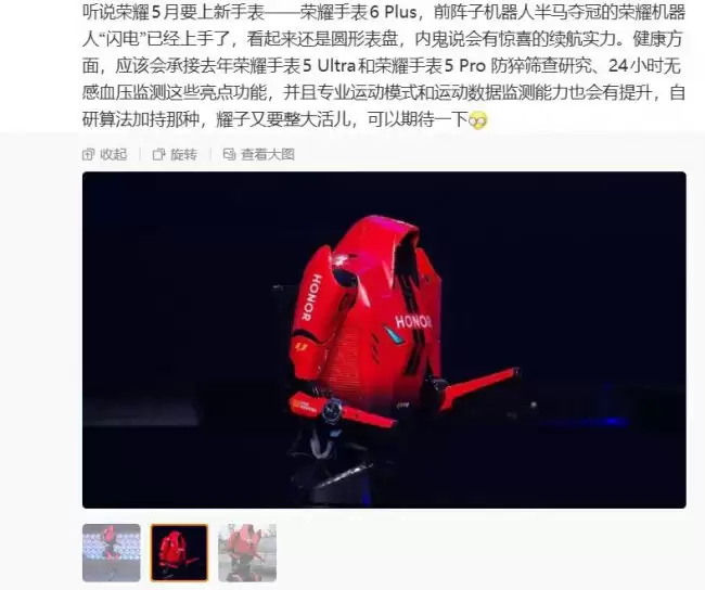 数码圈近日传来新消息。据知名爆料博主@数码闲聊站透露,荣耀或将在5月迎来新款智能手表——荣耀手表 6 Plus。有意思的是,此前在机器人半程马拉松中夺冠的荣耀机器人“闪电”似乎已经提前上手,从曝光的轮廓来看,新品依然采用了经典的圆形表盘设计。而更引人关注的是内部消息所指出的:其续航实力可能会带来不小的惊喜。