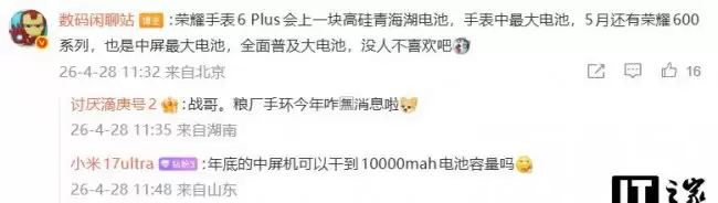该博主进一步透露,荣耀手表 6 Plus 将搭载一块高硅青海湖电池,这很可能成为同类手表产品中的最大电池。无独有偶,5月同期可能亮相的荣耀 600系列手机,据称也将配备中屏机型中的最大电池。这一系列动作表明,荣耀正在其产品线中全面普及大容量电池策略,用户体验的基石——续航,被摆在了更突出的位置。