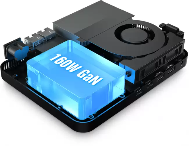 为了压住高性能硬件,GPD BOX内置了160W的氮化镓电源,采用了双风扇散热方案,并搭配了2根6mm加2根8mm的纯铜热管,散热堆料比较扎实。