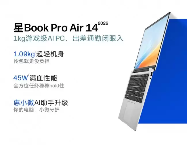 就在今天,惠普即将正式揭晓2026款星Book Pro Air 14轻薄本。这款新品的看点非常明确:在极致便携的机身里,塞进了不容小觑的性能。它搭载了英特尔酷睿Ultra 5 225H或Ultra 7 255H处理器,但最引人注目的两个数字是——整机重量仅1.09公斤,却依然能支撑起高达45瓦的性能释放。这意味着什么?意味着它很可能重新定义“轻薄本”的性能边界。
