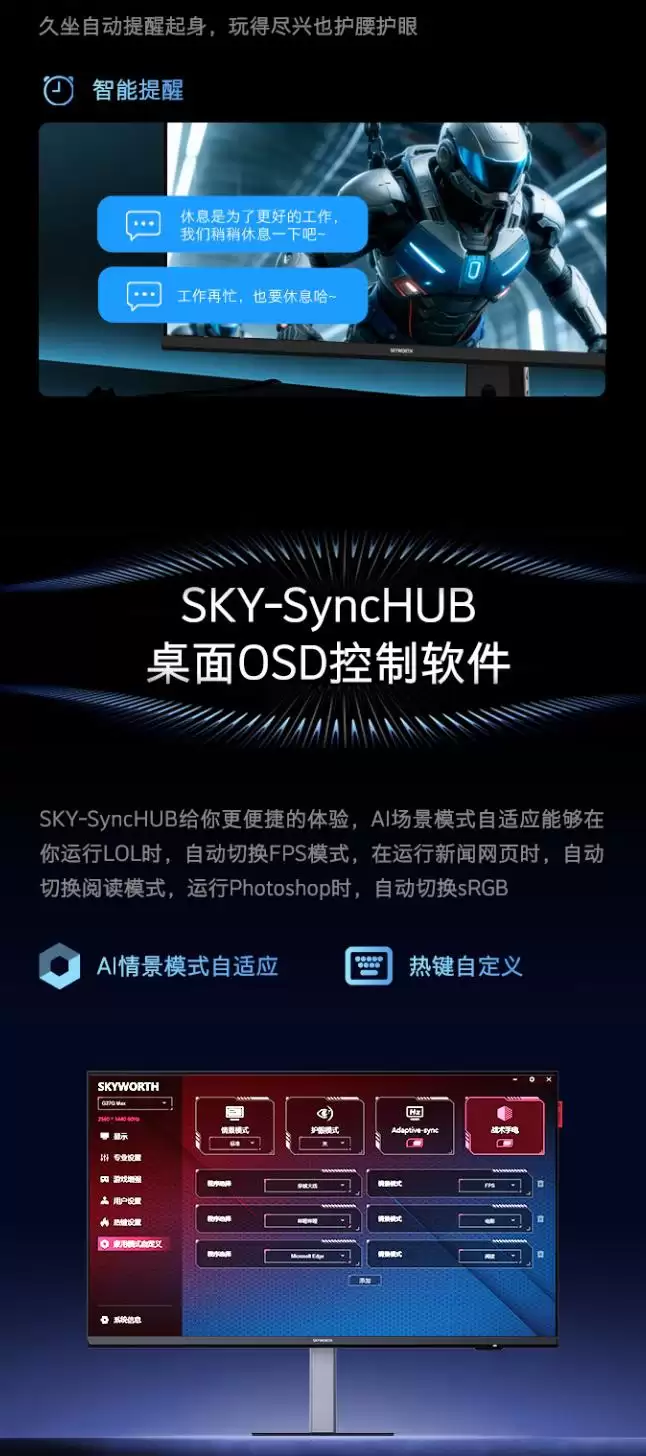 除了核心的画质与速度,这款显示器在功能细节上也做了不少文章。它具备动态OD(Overdrive)特调功能,能智能优化响应速度。针对FPS游戏玩家,它还内置了暗部区域提升、夜视仪、战术手电等实用工具,甚至提供了秒表帧率显示功能,方便硬核玩家进行数据监控。此外,显示器配备了环境光感应模块,可以根据周围光线自动调整屏幕亮度和色温,更护眼也更省电。VRR可变刷新率也是标配。在人体工学方面,自带的支架支持升降、俯仰以及垂直旋转调节,方便用户找到最舒适的观看角度。