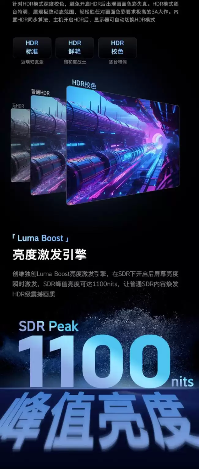 这款显示器的画质表现,很大程度上要归功于其“全链路精细控光”系统。简单来说,就是通过背光分区的精准控制,来实现更纯净的暗场和更耀眼的高光。它配备了72个独立控光分区,能够实时调节画面的明暗变化。其XDR峰值亮度可以达到1100nits,动态对比度更是达到了110万:1的高水准。在背光结构上,它采用了双芯8晶的微米级发光芯片,官方数据显示其聚光均匀性提升了83%。再加上独创的楔形透镜设计,能够对光源进行双重利用,理论上可以有效改善光晕现象。
